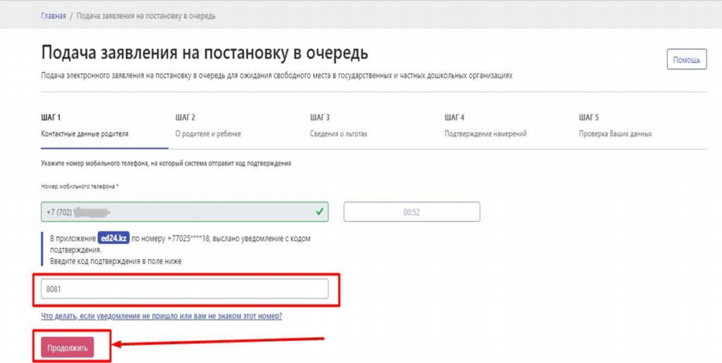 кнопку Отправить код подтверждения и в приложение ed24.kz будет