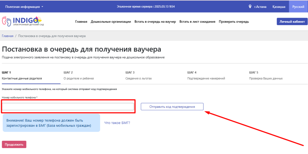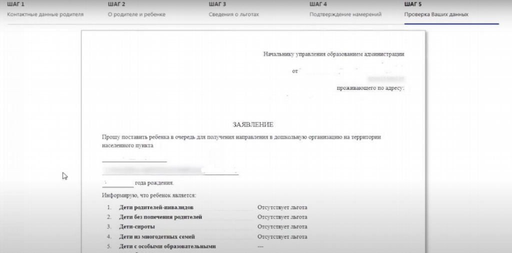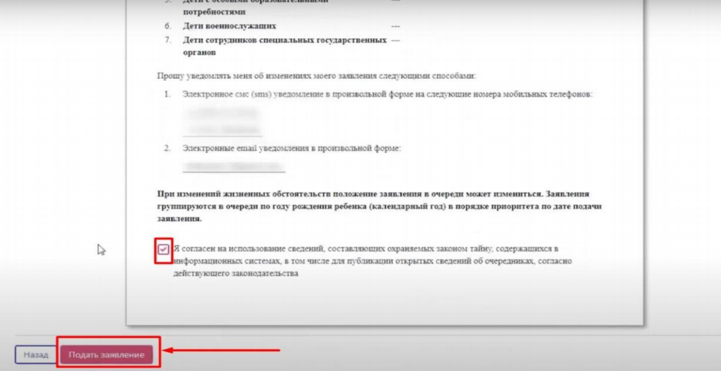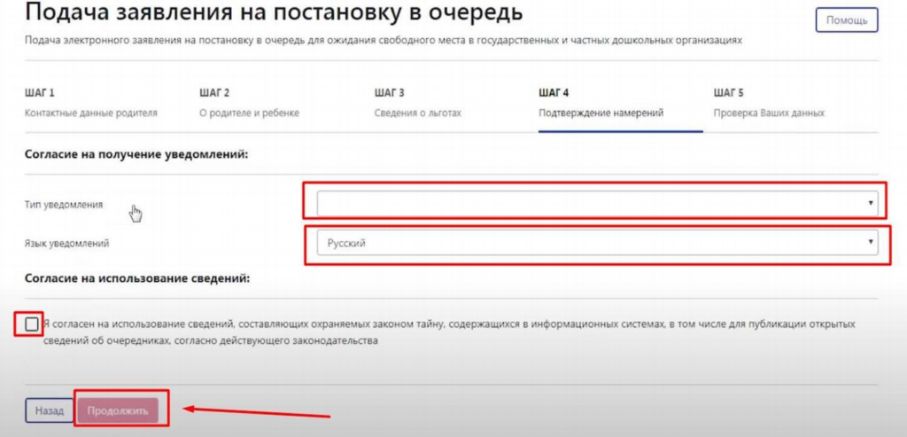уведомлений в процессе подачи заявления на постановку в очередь. Далее